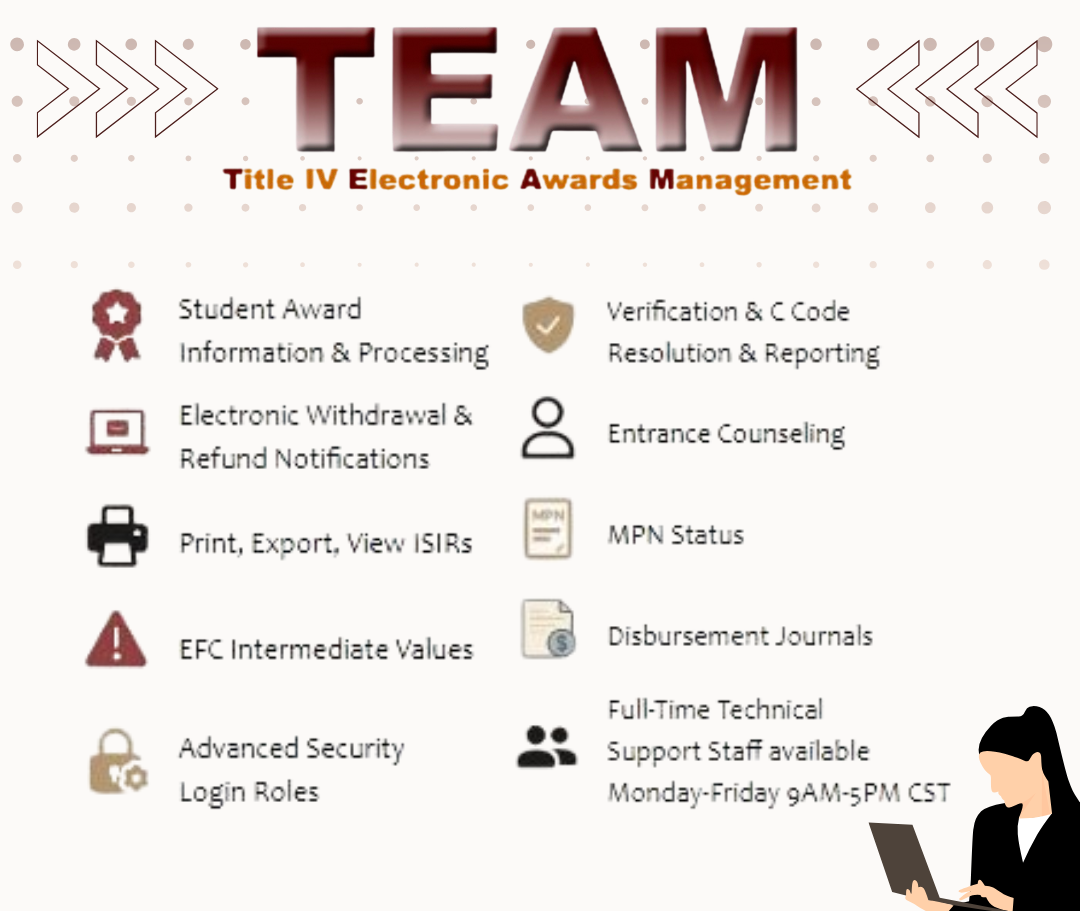TEAM Web-Based Application is Free to All GEMCOR, Inc. clientsTEAM (Title IV Electronic Awards Management) is a software system that allows schools the ease of requesting award requests to GEMCOR, eliminating the need to submit physical copies of ISIRs and other supporting documentation. It reduces the turnaround time on your awards, uses today's state of the art technology, and saves you from the expense and burden of copying and mailing cumbersome packages of student files. The TEAM system also includes electronic withdrawal and refund notifications, electronic subsequent payment requests, and most importantly, report capability ensuring that no students "slip through the cracks" and end up unprocessed. GEMCOR's TEAM software joins the best technical support team in the country, giving you effortless administration of your Title IV funds. TEAM is customized based on ED regulations and institutional profiles with built-in edits and formulas that ensure accurate award determinations and disbursement scheduling. Using the TEAM approach to award processing is simple and efficient. Your electronic ISIR files, obtained through USDE's EDExpress software or through GEMCOR's Software, are imported into the database. After selecting a student to award, simply enter the program length, cost, and start date. Your electronic award requests can be transmitted to GEMCOR electronically. |